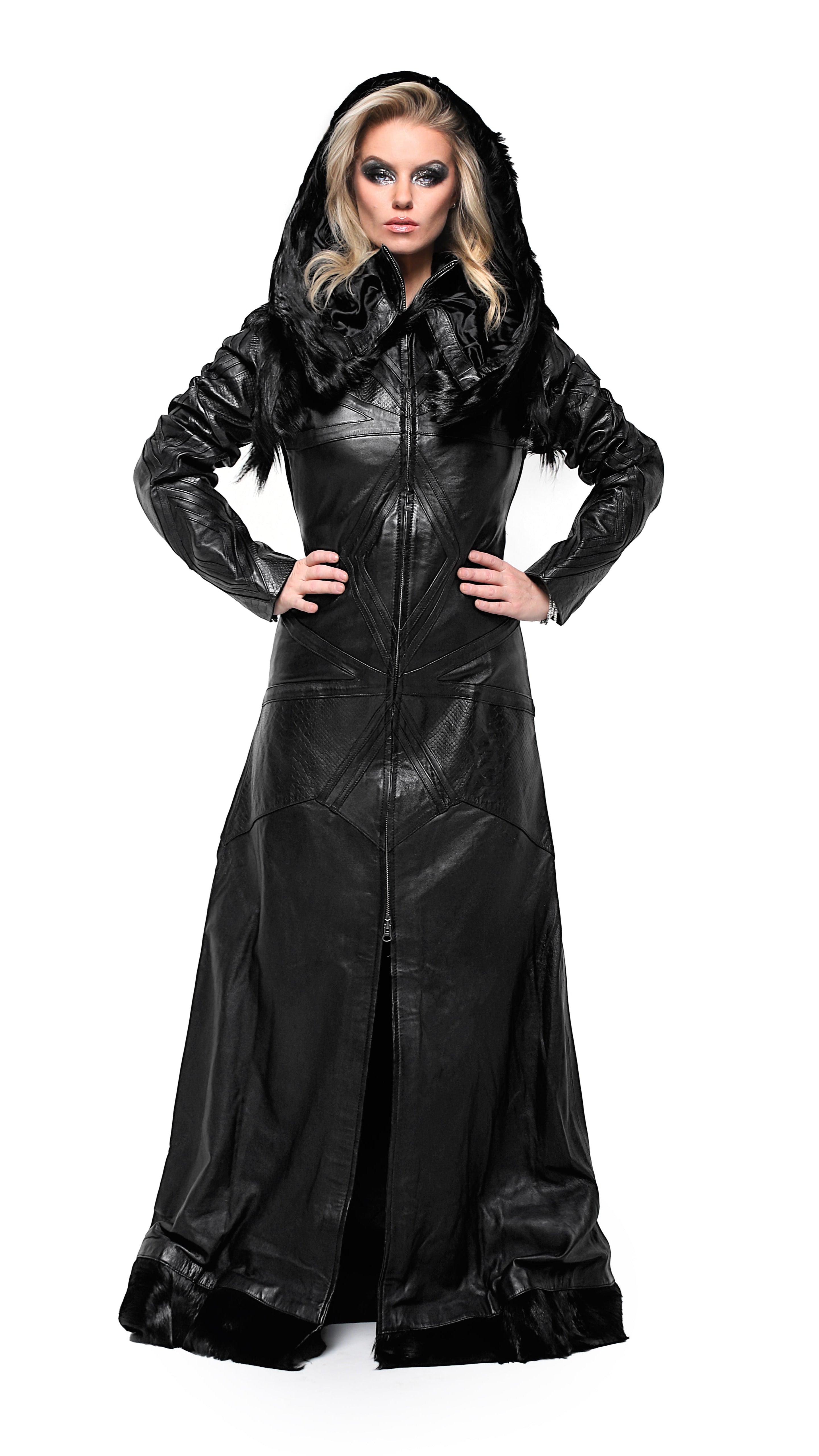 Floor length leather jacket with geometric grid paneling armor detail, detachable hood, and double zipper closure.